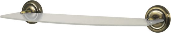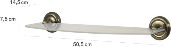 Praktyczna półka łazienkowa BISK Deco, utrzymana w modnej stylistyce retro, wykonana ze szkła matowego i wytrzymałego metalu w kolorze antycznego mosiądzu.
