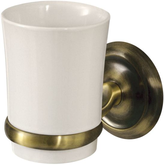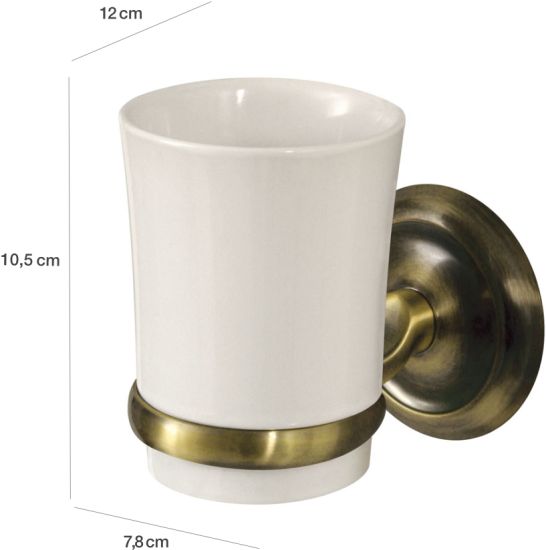 Praktyczny kubeczek wiszący BISK Deco, utrzymany w modnej stylistyce retro, wykonany z ceramiki i wytrzymałego metalu w kolorze antycznego mosiądzu.