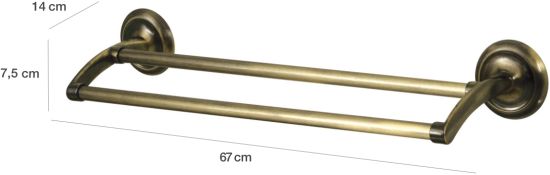 Elegancki podwójny wieszak na ręczniki BISK Deco, utrzymany w modnej stylistyce retro, wykonany z wytrzymałego metalu w kolorze antycznego mosiądzu.