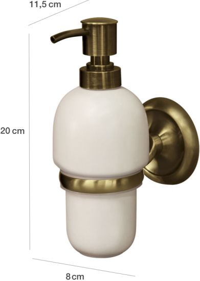 Praktyczny dozownik mydła w płynie BISK Deco, utrzymany w modnej stylistyce retro, wykonany z ceramiki i wytrzymałego metalu w kolorze antycznego mosiądzu.