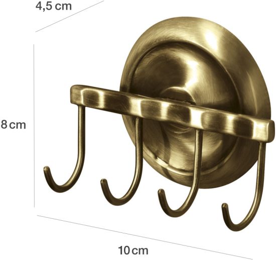 Funkcjonalny wieszak z czterema haczykami BISK Deco, utrzymany w modnej stylistyce retro, wykonany z wytrzymałego metalu w kolorze antycznego mosiądzu.