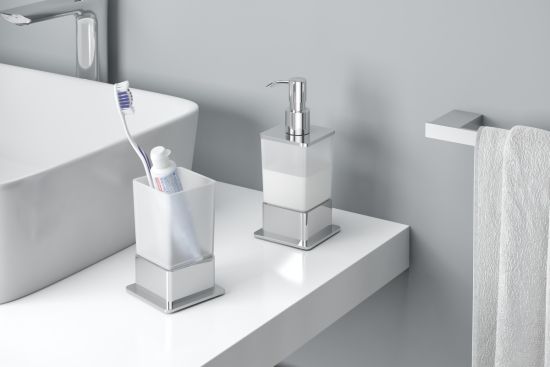 Praktyczny, stojący kubek łazienkowy EXCELLENT Riko na szczoteczki do zębów lub inne akcesoria, wykonany ze szkła matowego i mosiądzu o trwałym połysku.