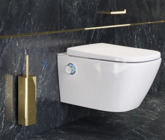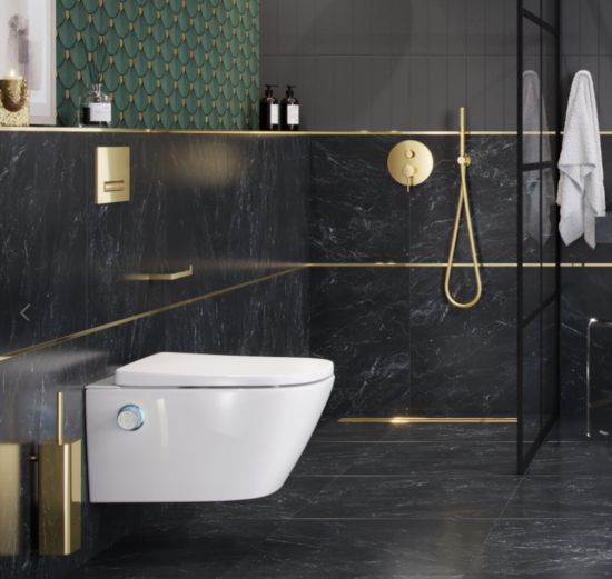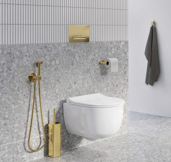 Praktyczna, wolnostojąca szczotka do WC EXCELLENT Riko Gold, wykonana z wytrzymałego mosiądzu pokrytego specjalną powłoką w złotym kolorze.