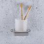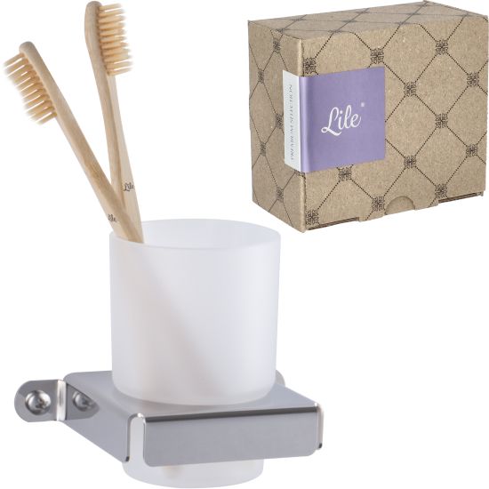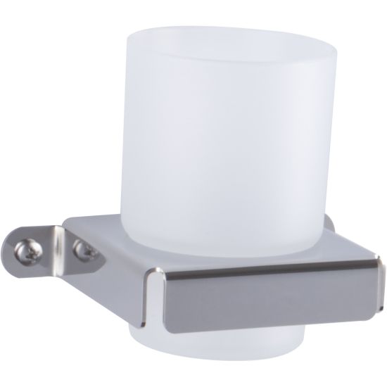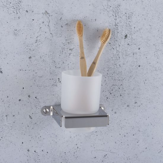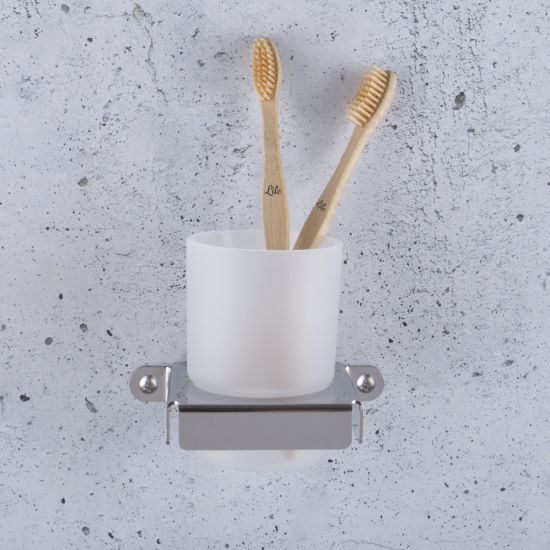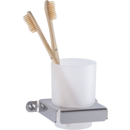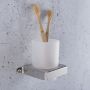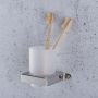 Nowoczesny kubeczek łazienkowy wiszący, osadzony w uchwycie wykonanym z wysokiej jakości stali nierdzewnej.