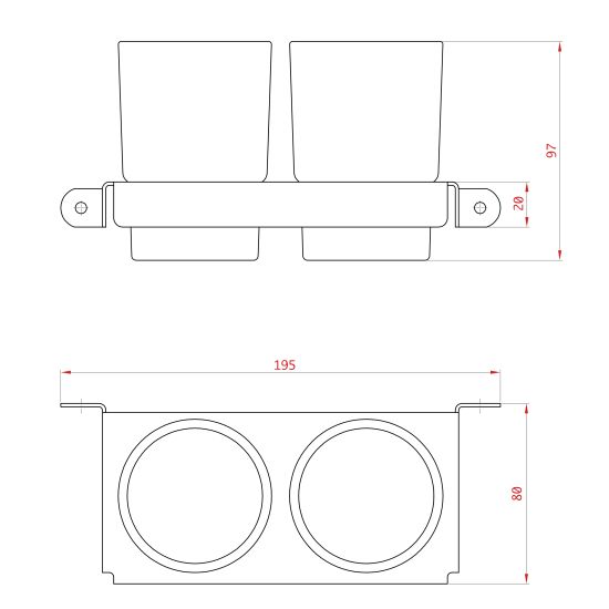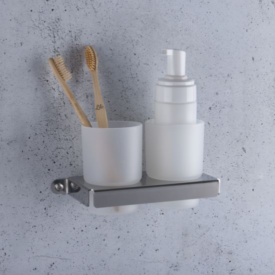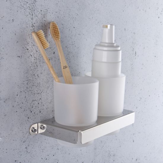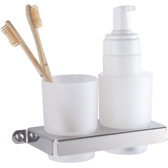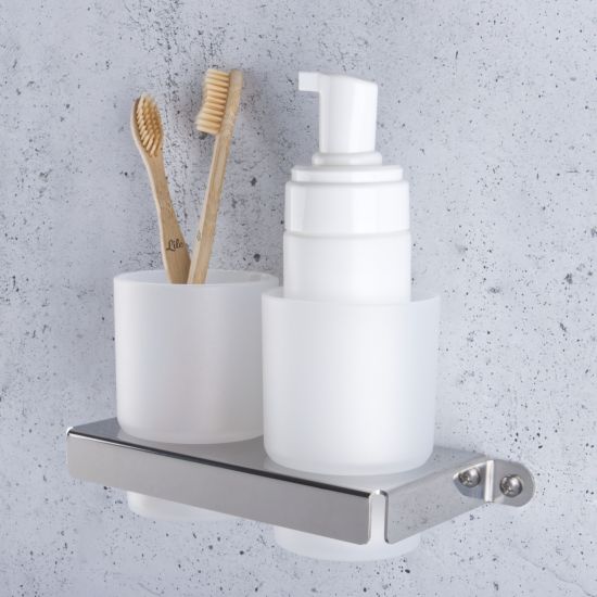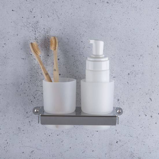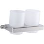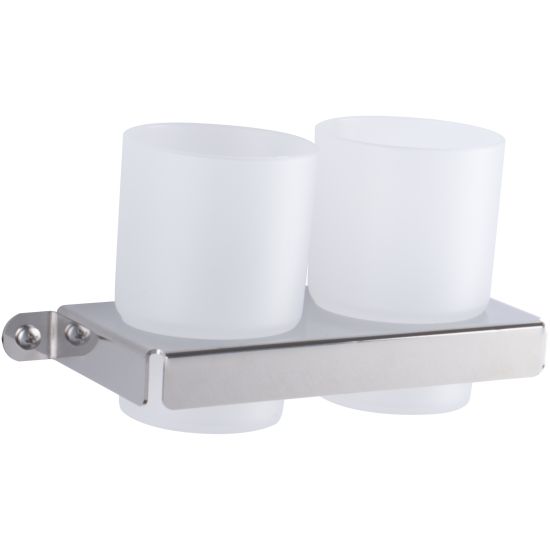 Nowoczesny kubeczek podwójny wiszący, osadzony w uchwycie wykonanym z wysokiej jakości stali nierdzewnej.