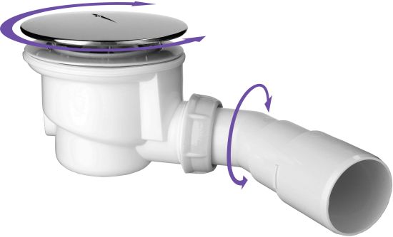 Budowa Radaway 690P umożliwia niezwykle łatwe, wielokierunkowe pozycjonwanie syfonu w celu łatwego podłączenia do pionu kanalizacyjnego i ustawienia odpowiedniego spadu wody. Syfon można obracać zarówno w osi względem brodzika jak i regulować kąt kolanka przyłączeniowego względem całego syfonu. Takie rozwiązanie znacząco ułatwia pracę instalatora, pozwalając na szybkie i precyzyjne dostosowanie syfonu do indywidualnych warunków montażowych, nawet w trudnych lub ograniczonych przestrzeniach.