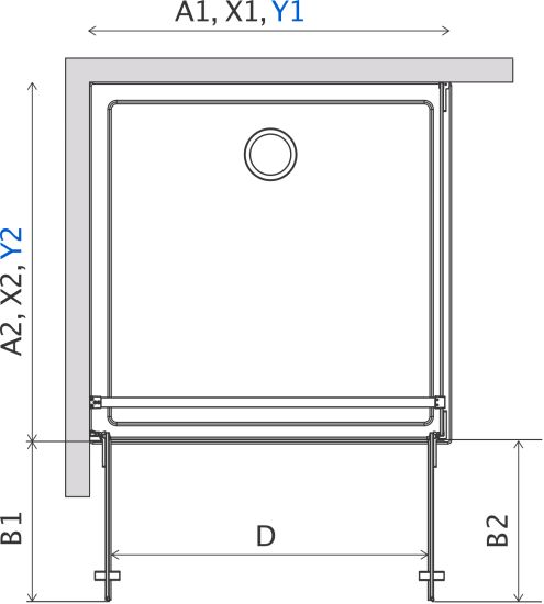 X - wymiar X1 i X2 to wymiar zewnętrzny kabiny (licząc od ściany do zewnętrznego obrysu profilu, zawiasu lub klamry). Jeśli chcesz, aby zewnętrzna krawędź profilu, zawiasu lub klamry kabiny była zamontowana na krawędzi płytek/fudze weź pod uwagę ten wymiar.