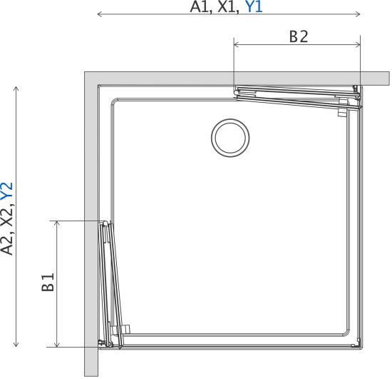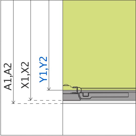 X - wymiar X1 i X2 to wymiar zewnętrzny kabiny (licząc od ściany do zewnętrznego obrysu profilu, zawiasu lub klamry). Jeśli chcesz, aby zewnętrzna krawędź profilu, zawiasu lub klamry kabiny była zamontowana na krawędzi płytek/fudze weź pod uwagę ten wymiar.
