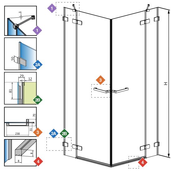 Y - jeśli chcesz, aby osie szyby w kabinie były zamontowane na łączeniu płytek (przebiegały wzgłuż fugi) bez konieczności zamawiania kabiny niestandardowej weź pod uwagę wymiar Y1 i Y2.