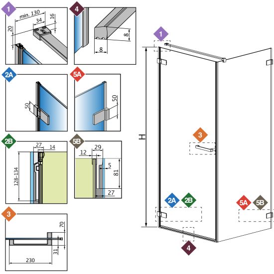A - w przypadku montażu na brodziku weź pod uwagę wymiar A1 i A2 - jest to wymiar zewnętrzny pasującego brodzika.