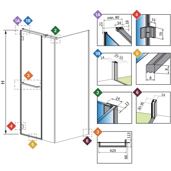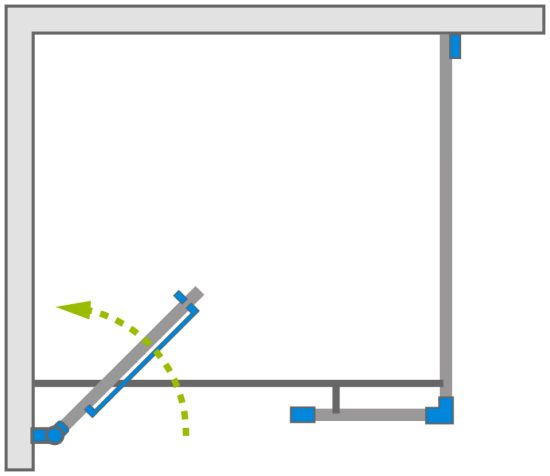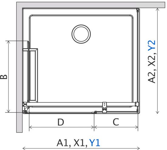X - wymiar X1 i X2 to wymiar zewnętrzny kabiny (licząc od ściany do zewnętrznego obrysu profilu, zawiasu lub klamry). Jeśli chcesz, aby zewnętrzna krawędź profilu, zawiasu lub klamry kabiny była zamontowana na krawędzi płytek/fudze weź pod uwagę ten wymiar.