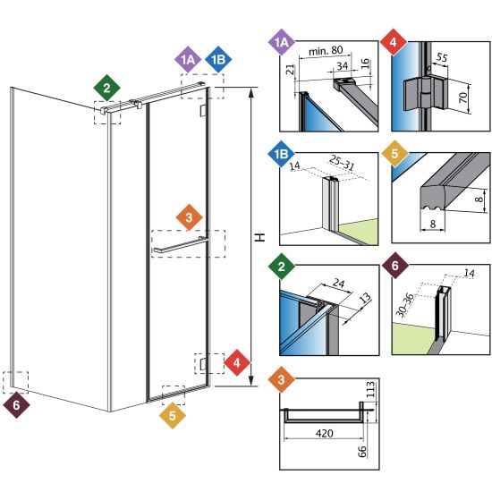 | Wymiar kabiny do osi szyby (Y1): | 1184-1190 mm, 884-890 mm, 984-990 mm |