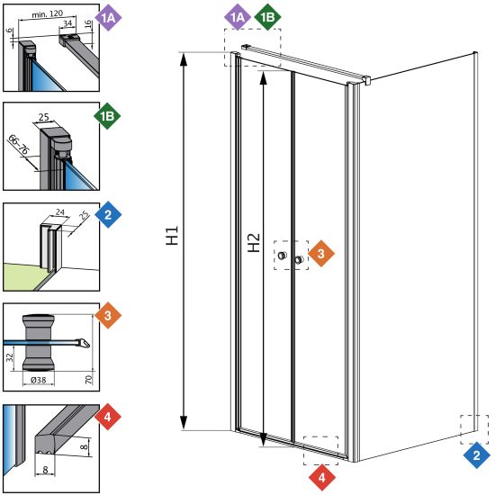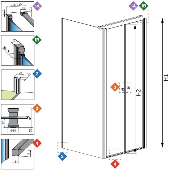 | Wymiar kabiny do osi szyby (Y1): | 1075-1085 mm, 1175-1185 mm, 775-785 mm, 875-885 mm, 975-985 mm |
