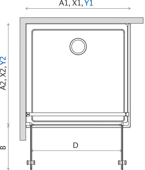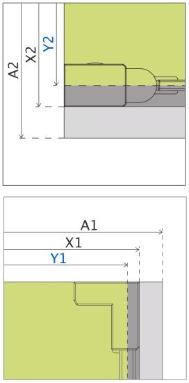 X - wymiar X1 i X2 to wymiar zewnętrzny kabiny (licząc od ściany do zewnętrznego obrysu profilu, zawiasu lub klamry). Jeśli chcesz, aby zewnętrzna krawędź profilu, zawiasu lub klamry kabiny była zamontowana na krawędzi płytek/fudze weź pod uwagę ten wymiar.