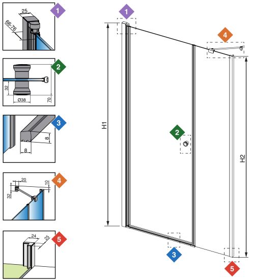 | Szerokość ścianki drzwi (C): | 340-355 mm, 440-455 mm, 540-555 mm |