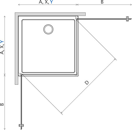 X - wymiar X1 to wymiar zewnętrzny kabiny (licząc od ściany do zewnętrznego obrysu profilu, zawiasu lub klamry). Jeśli chcesz, aby zewnętrzna krawędź profilu, zawiasu lub klamry kabiny była zamontowana na krawędzi płytek/fudze weź pod uwagę ten wymiar.