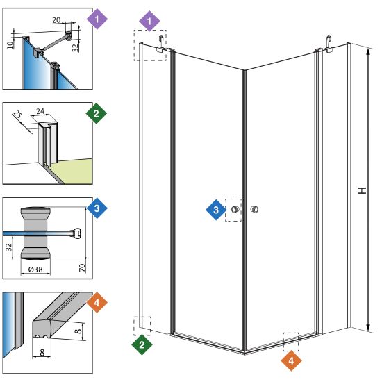 | Wymiar kabiny do osi szyby (Y1): | 770-785 mm, 870-885 mm, 970-985 mm |