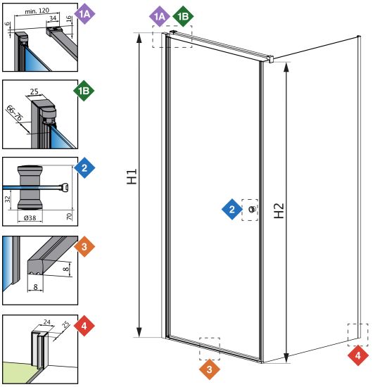 | Wymiar kabiny do osi szyby (Y1): | 775-785 mm, 875-885 mm, 975-985 mm |