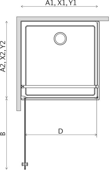 X - wymiar X1 i X2 to wymiar zewnętrzny kabiny (licząc od ściany do zewnętrznego obrysu profilu, zawiasu lub klamry). Jeśli chcesz, aby zewnętrzna krawędź profilu, zawiasu lub klamry kabiny była zamontowana na krawędzi płytek/fudze weź pod uwagę ten wymiar.