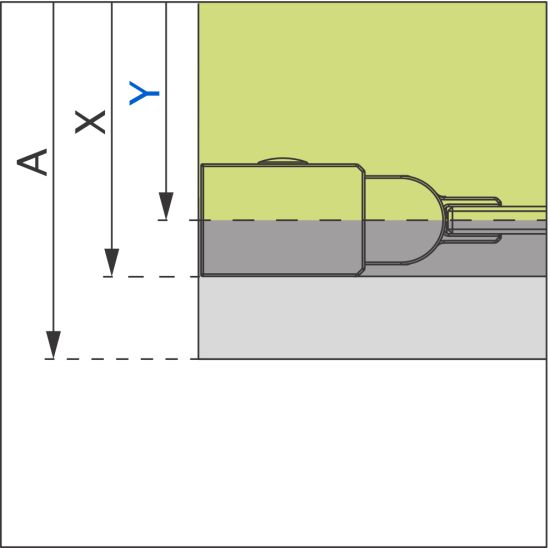 X - to wymiar zewnętrzny kabiny (licząc od ściany do zewnętrznego obrysu profilu, zawiasu lub klamry). Jeśli chcesz, aby zewnętrzna krawędź profilu, zawiasu lub klamry kabiny była zamontowana na krawędzi płytek/fudze weź pod uwagę ten wymiar.