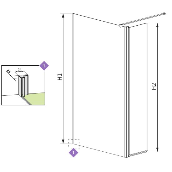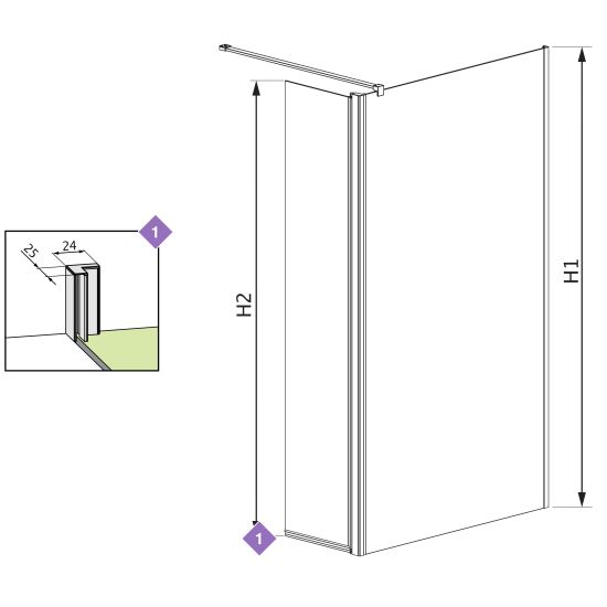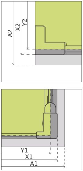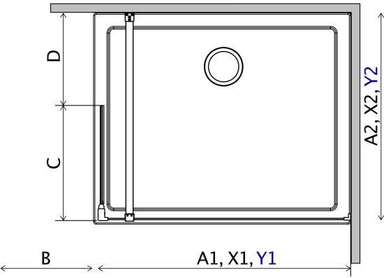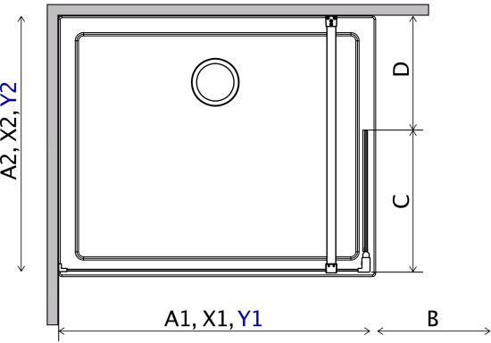 X - wymiar X1 i X2 to wymiar zewnętrzny kabiny (licząc od ściany do zewnętrznego obrysu profilu, zawiasu lub klamry). Jeśli chcesz, aby zewnętrzna krawędź profilu, zawiasu lub klamry kabiny była zamontowana na krawędzi płytek/fudze weź pod uwagę ten wymiar.