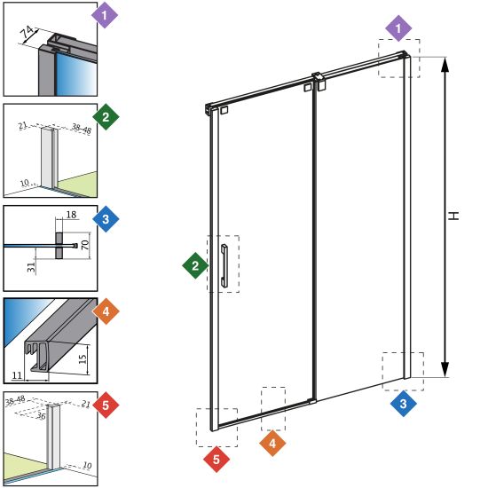 | Szerokość ścianki drzwi (C): | 477-487 mm, 527-537 mm, 577-587 mm, 677-687 mm, 777-787 mm |