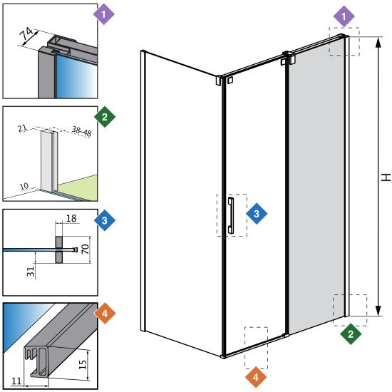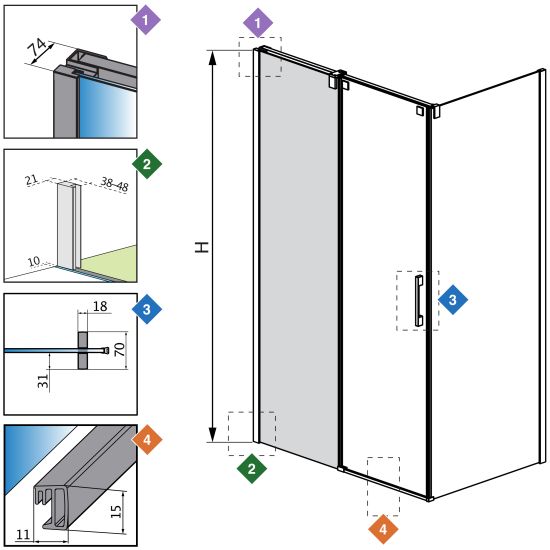 | Wymiar kabiny do osi szyby (Y2): | 678-688 mm, 728-738 mm, 778-788 mm, 878-888 mm, 978-988 mm |