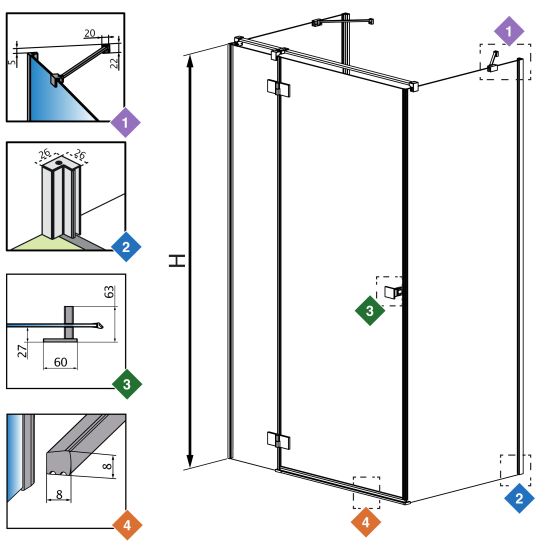 | Wymiar kabiny do osi szyby (Y2): | 667-682 mm, 717-732 mm, 767-782 mm, 867-882 mm, 967-982 mm |