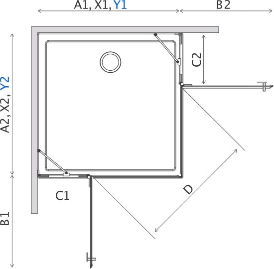 X - wymiar X1 i X2 to wymiar zewnętrzny kabiny (licząc od ściany do zewnętrznego obrysu profilu, zawiasu lub klamry). Jeśli chcesz, aby zewnętrzna krawędź profilu, zawiasu lub klamry kabiny była zamontowana na krawędzi płytek/fudze weź pod uwagę ten wymiar.