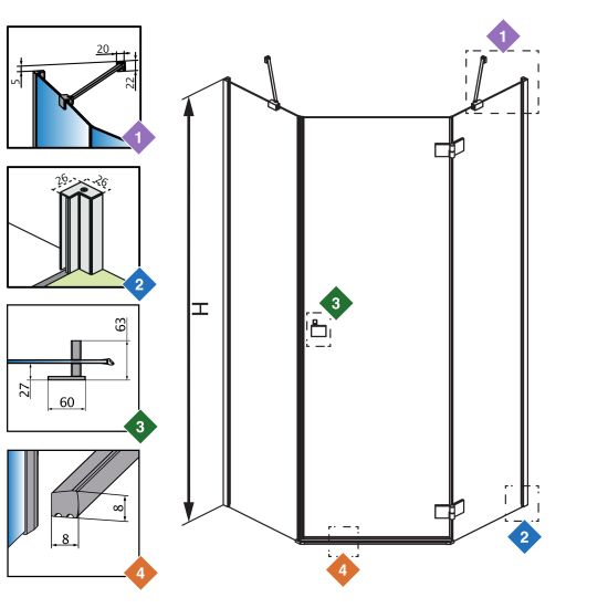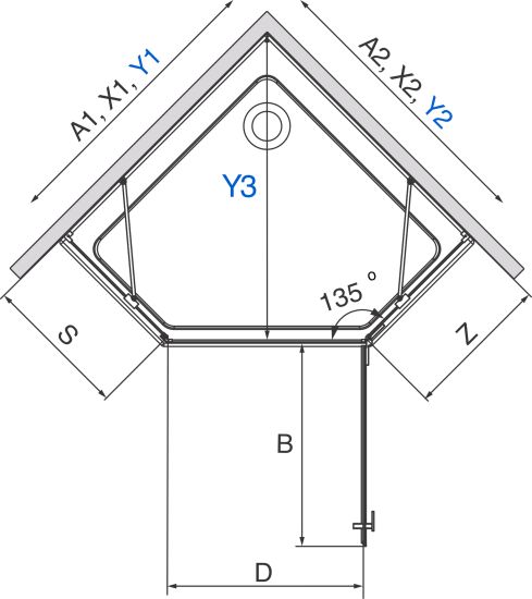 | Wymiar kabiny do osi szyby (Y1): | 767-782 mm, 768-783 mm, 867-882 mm, 868-883 mm, 967-982 mm, 968-983 mm |