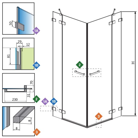 | Wymiar kabiny do osi szyby (Y1): | 773-783 mm, 873-883 mm, 973-983 mm |