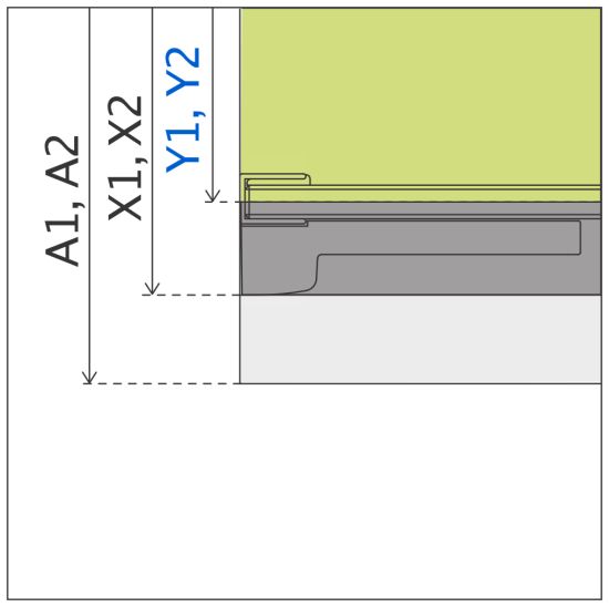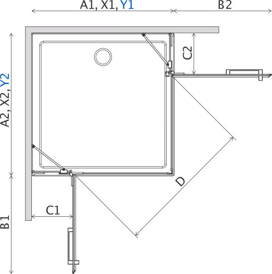 X - wymiar X1 i X2 to wymiar zewnętrzny kabiny (licząc od ściany do zewnętrznego obrysu profilu, zawiasu lub klamry). Jeśli chcesz, aby zewnętrzna krawędź profilu, zawiasu lub klamry kabiny była zamontowana na krawędzi płytek/fudze weź pod uwagę ten wymiar.