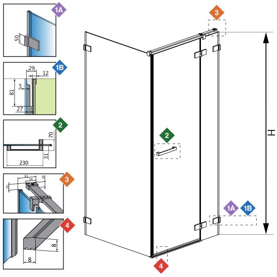 Y - jeśli chcesz, aby osie szyby w kabinie były zamontowane na łączeniu płytek (przebiegały wzgłuż fugi) bez konieczności zamawiania kabiny niestandardowej weź pod uwagę wymiar Y1 i Y2.