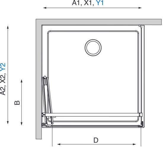 X - wymiar X1 i X2 to wymiar zewnętrzny kabiny (licząc od ściany do zewnętrznego obrysu profilu, zawiasu lub klamry). Jeśli chcesz, aby zewnętrzna krawędź profilu, zawiasu lub klamry kabiny była zamontowana na krawędzi płytek/fudze weź pod uwagę ten wymiar.