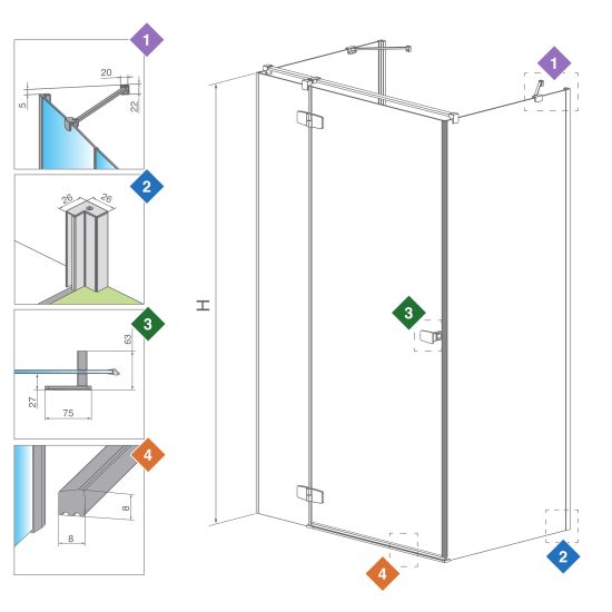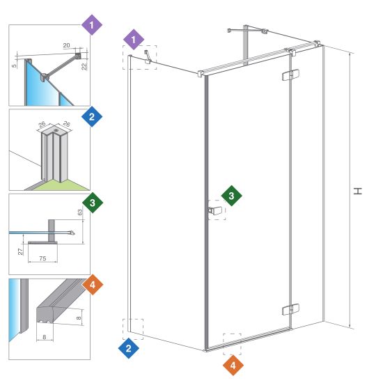 | Wymiar kabiny do osi szyby (Y2): | 667-682 mm, 717-732 mm, 767-782 mm, 867-882 mm, 967-982 mm |