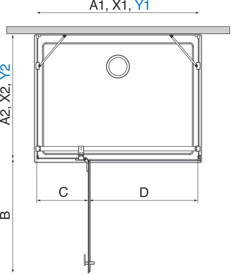 X - wymiar X1 i X2 to wymiar zewnętrzny kabiny (licząc od ściany do zewnętrznego obrysu profilu, zawiasu lub klamry). Jeśli chcesz, aby zewnętrzna krawędź profilu, zawiasu lub klamry kabiny była zamontowana na krawędzi płytek/fudze weź pod uwagę ten wymiar.