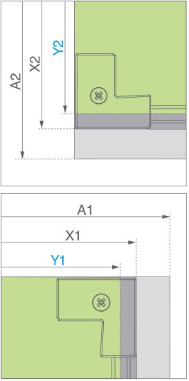 X - wymiar X1 i X2 to wymiar zewnętrzny kabiny (licząc od ściany do zewnętrznego obrysu profilu, zawiasu lub klamry). Jeśli chcesz, aby zewnętrzna krawędź profilu, zawiasu lub klamry kabiny była zamontowana na krawędzi płytek/fudze weź pod uwagę ten wymiar.