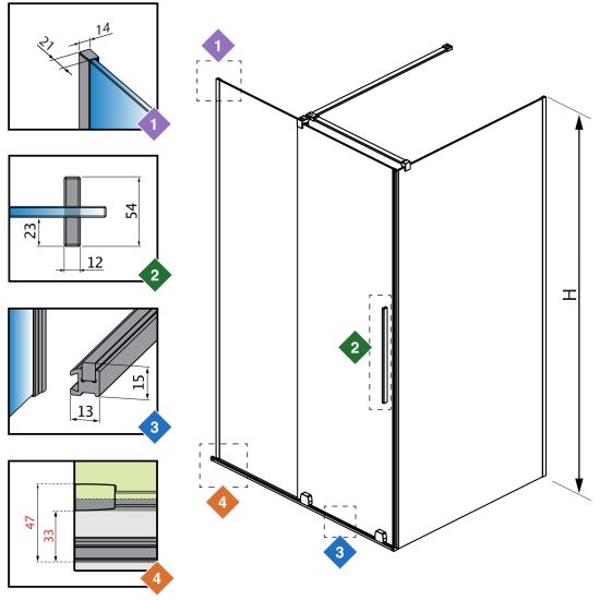 | Wymiar kabiny do osi szyby (Y1): | 1079-1089 mm, 1179-1189 mm, 1279-1289 mm, 1379-1389 mm, 1479-1489 mm, 1579-1589 mm, 879-889 mm, 979-989 mm |