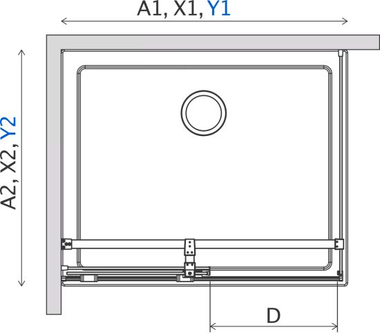 X - wymiar X1 i X2 to wymiar zewnętrzny kabiny (licząc od ściany do zewnętrznego obrysu profilu, zawiasu lub klamry). Jeśli chcesz, aby zewnętrzna krawędź profilu, zawiasu lub klamry kabiny była zamontowana na krawędzi płytek/fudze weź pod uwagę ten wymiar.