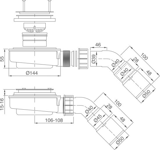 Syfon posiada wysokość montażową wynoszącą 55 mm. Jest to syfon o niskiej wysokości montażowej, co czyni go odpowiednim wyborem w sytuacji, gdy przestrzeń na instalację hydrauliczną jest ograniczona. Radaway jest syfonem o szerokim spektrum zastosowań. Świetnie sprawdzi się w zestawie z brodzikami płaskimi montowanymi bezpośredino na płytkach lub posadzce, ale również z brodzikami kompaktowymi i wysokimi, mającymi średnicę otworu odpływowego 90 mm .