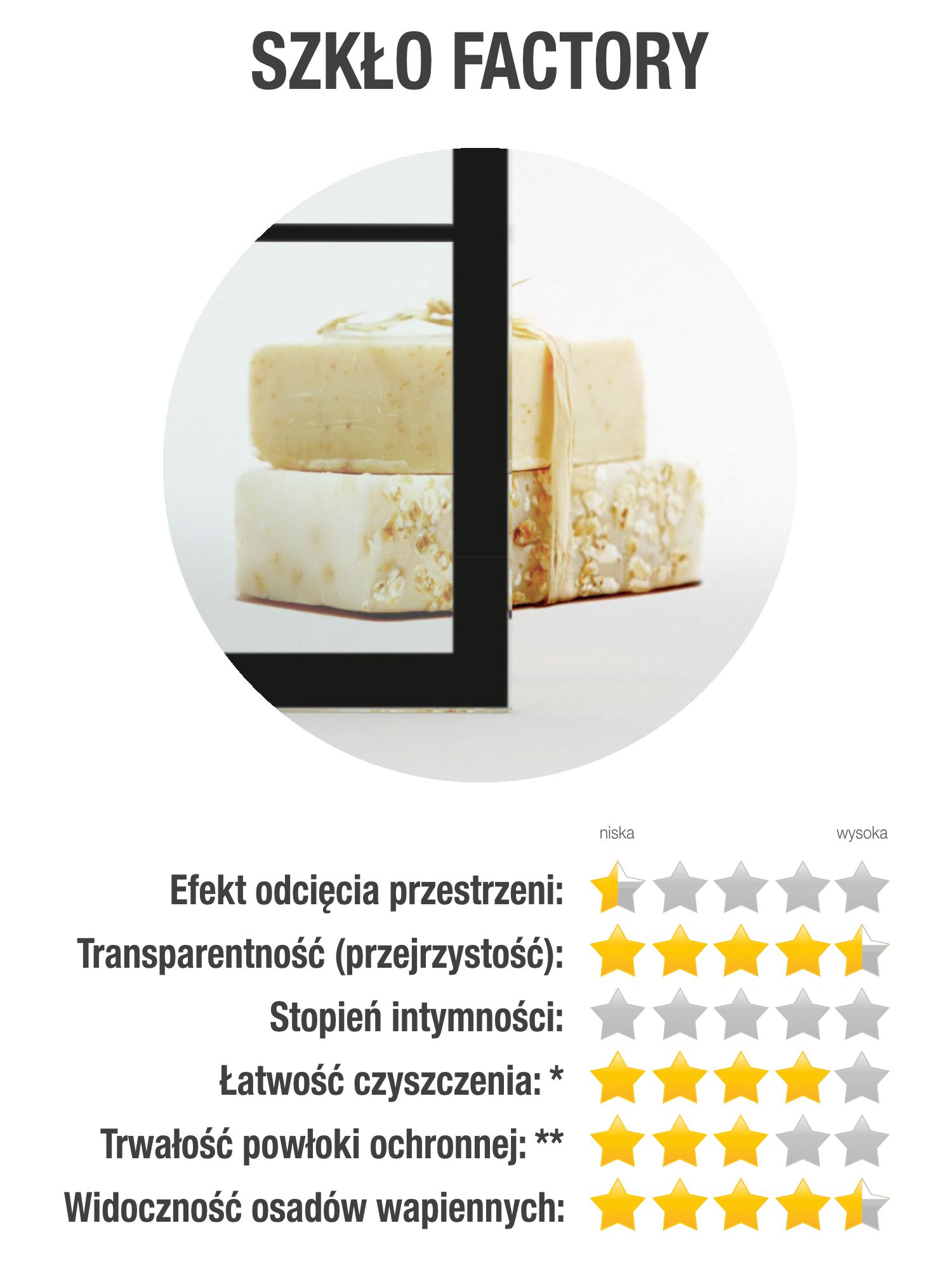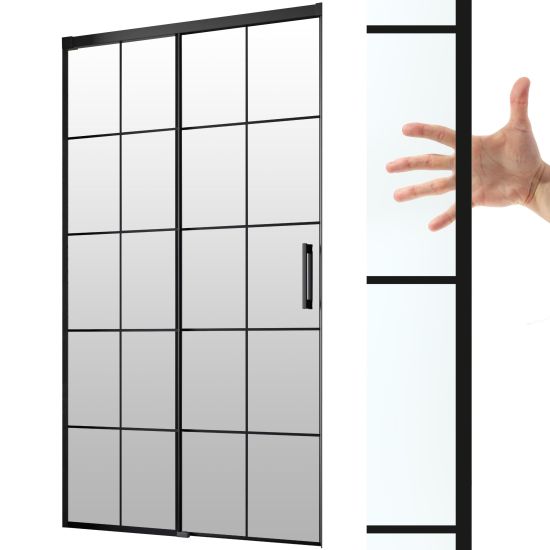 Oferowana kabina posiada szkło Factory, które posiada charakterystyczne czarne szprosy wykonane trwałą farbą ceramiczną, które zespalają się ze szkłem podczas procesu hartowania. Szkło tego typu jest gładkie z obu stron, przezroczyste i charakteryzuje się lekko zielonkawą barwą, widoczną szczególnie na oszlifowanych krawędziach.
