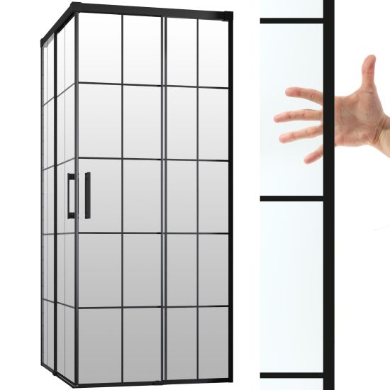 Oferowana kabina posiada szkło Factory, które posiada charakterystyczne czarne szprosy wykonane trwałą farbą ceramiczną, które zespalają się ze szkłem podczas procesu hartowania. Szkło tego typu jest gładkie z obu stron, przezroczyste i charakteryzuje się lekko zielonkawą barwą, widoczną szczególnie na oszlifowanych krawędziach.