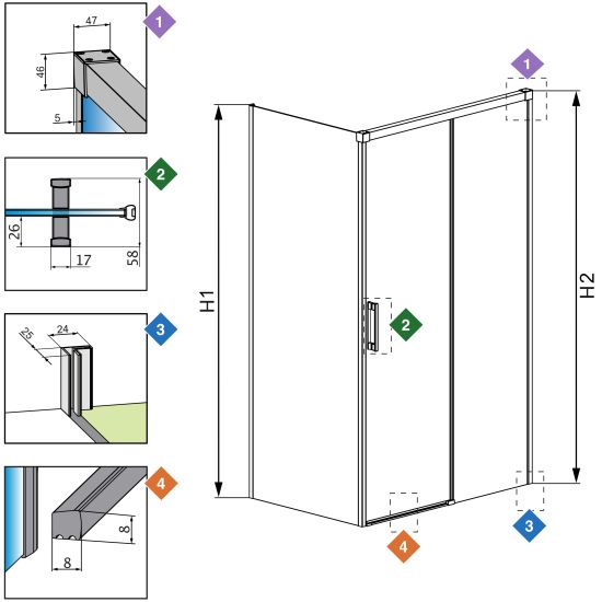 X - wymiar X1 i X2 to wymiar zewnętrzny kabiny (licząc od ściany do zewnętrznego obrysu profilu, zawiasu lub klamry). Jeśli chcesz, aby zewnętrzna krawędź profilu, zawiasu lub klamry kabiny była zamontowana na krawędzi płytek/fudze weź pod uwagę ten wymiar.