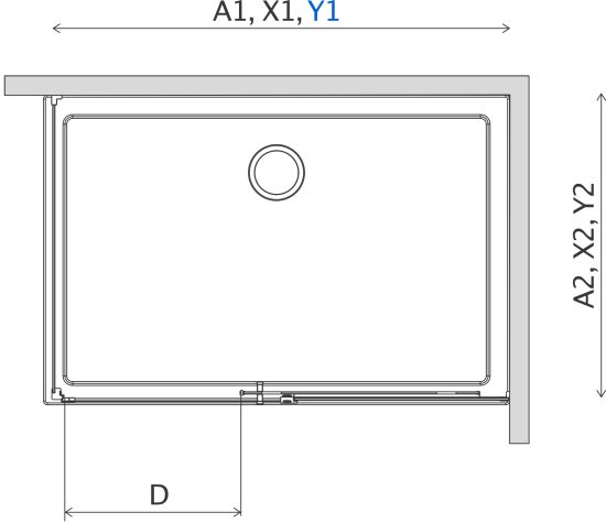 X - wymiar X1 i X2 to wymiar zewnętrzny kabiny (licząc od ściany do zewnętrznego obrysu profilu, zawiasu lub klamry). Jeśli chcesz, aby zewnętrzna krawędź profilu, zawiasu lub klamry kabiny była zamontowana na krawędzi płytek/fudze weź pod uwagę ten wymiar.