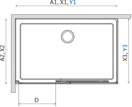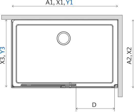 X - wymiar X1 i X2 i X3 to wymiar zewnętrzny kabiny (licząc od ściany do zewnętrznego obrysu profilu, zawiasu lub klamry). Jeśli chcesz, aby zewnętrzna krawędź profilu, zawiasu lub klamry kabiny była zamontowana na krawędzi płytek/fudze weź pod uwagę ten wymiar.