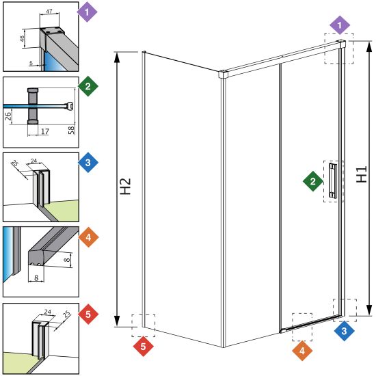 Y - jeśli chcesz, aby osie szyby w kabinie były zamontowane na łączeniu płytek (przebiegały wzgłuż fugi) bez konieczności zamawiania kabiny niestandardowej weź pod uwagę wymiar Y1 i Y3.