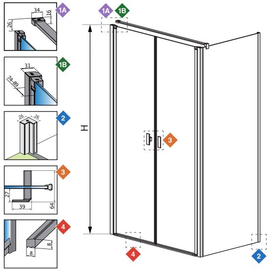 | Wymiar kabiny do osi szyby (Y2): | 670-685 mm, 720-735 mm, 770-785 mm, 870-885 mm, 970-985 mm |