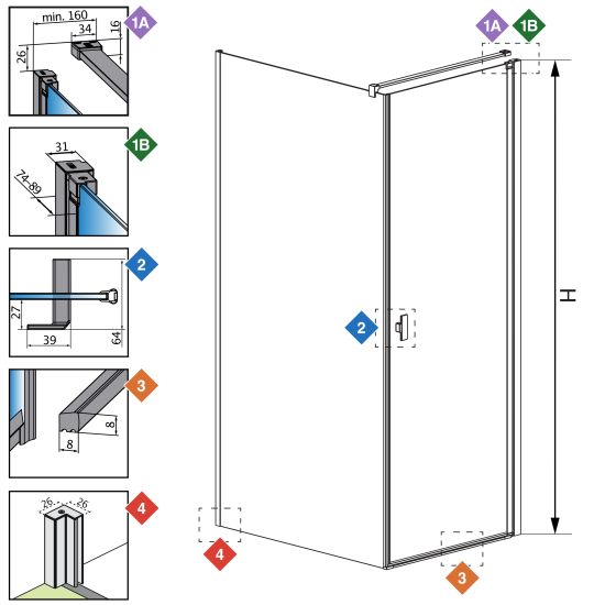 X - wymiar X1 i X2 to wymiar zewnętrzny kabiny (licząc od ściany do zewnętrznego obrysu profilu, zawiasu lub klamry). Jeśli chcesz, aby zewnętrzna krawędź profilu, zawiasu lub klamry kabiny była zamontowana na krawędzi płytek/fudze weź pod uwagę ten wymiar.