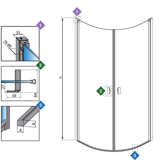 | Wymiar kabiny do osi szyby (Y): | 770-785 mm, 870-885 mm |