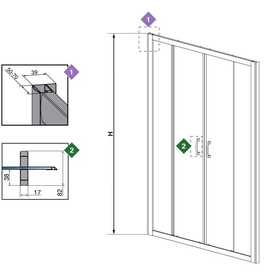 | Szerokość ścianki drzwi (C): | 292-312 mm, 342-362 mm, 392-412 mm |